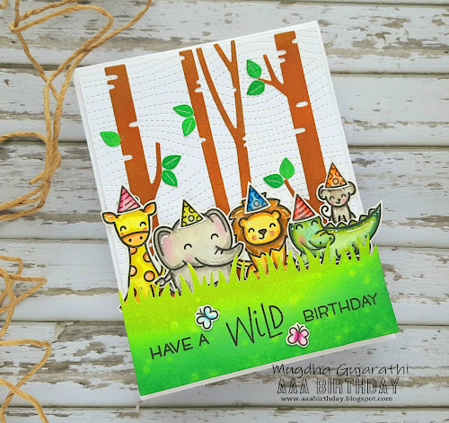 I used Wild for you stamp by Lawn Fawn and colored the images using zigs. I fussy cut all the images and foam mounted them.for background I used Stiched woodgrain die by lawn fawn.
