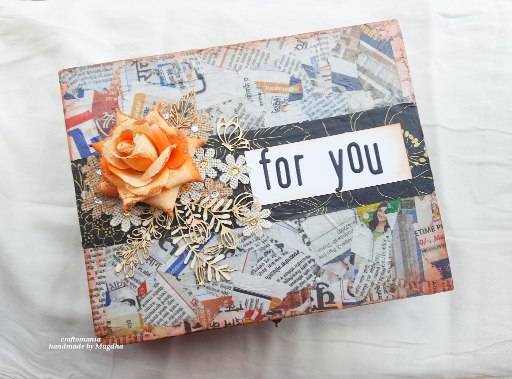 I then used caramel toffee ink from Summer afternoon ink cubes set on the edges of the box to give it a bit vintage look. I kept the Altenew packing paper ( as it was beautiful) which came with my order and thought to use it over my box. I also used a flower ( Which was from a broken vase) , tiny MDF cutouts, fabric flowers to decorate my box. I used Tall Alpha lowercase die for sentiment '' For you" and adhered it on a strip of white paper.
